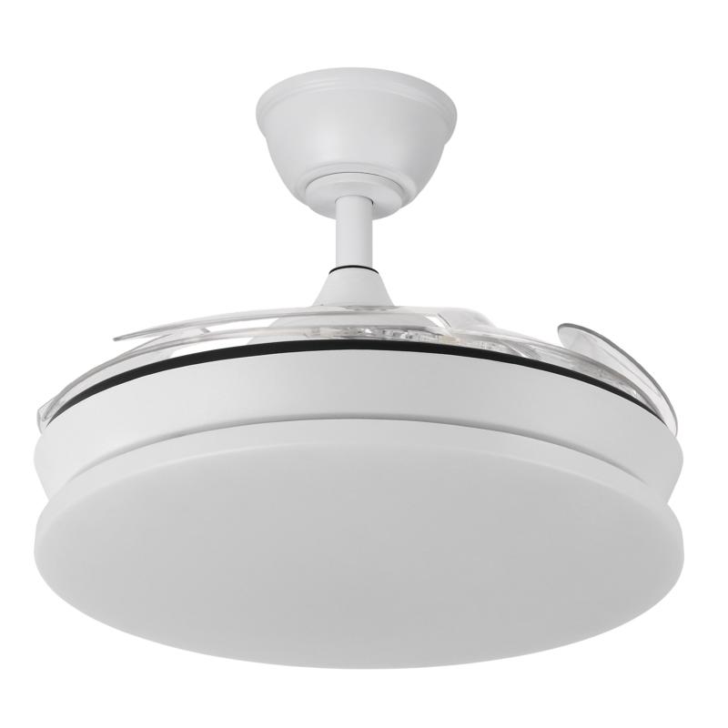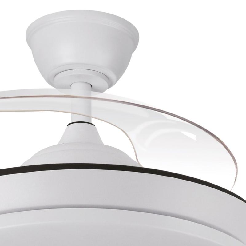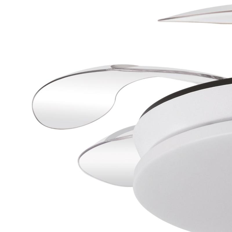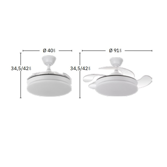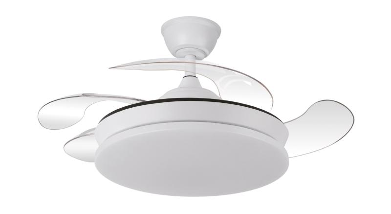 | Ventilador de Techo Tridente Mini Fabrilamp | Ventilador DC de la serie TRIDENTE MINI realizado en metal, policarbonato y ABS, en color BLANCO con cuatro aspas DESPLEGABLES de ABS transparente muy resistentes. De diseño innovador, ideal para completar tanto en decoraciones modernas como clásicas, realizando tanto la función de lámpara como de ventilador. Motor DC con seis velocidades ajustables. Tecnología LED integrada con una potencia de 59W, 6980 lúmenes y 3 TEMPERATURAS SELECCIONABLES DE LUZ (3000-4000-6000K) luz cálida, natural y blanco frío. Es REGULABLE EN INTENSIDAD, con mando a distancia INCLUIDO con MEMORIA DE COLOR incorporada y TEMPORIZADOR 2/4 H. Control de aire verano o invierno. Su medida es de 34,5/42X40 centímetros con las aspas plegadas y de 34,5/42X91 centímetros con las aspas desplegadas. Incluye dos tijas de 12,5 y 20 centímetros, para colocar a distintas alturas. Encontramos en esta serie dos tamaños de ventiladores y en los colores blanco, negro, níquel y cuero, para elegir el más le guste y el que mejor se adapte a su decoración.. | Características Ventilador Tridente Mini Fabrilamp | Materiales | - Base Motor: Metal - Aspas: Acrílicas - Difusor inferior: Policarbonato y metal | | Tonalidad de Metal | Blanco | Accionado mediante | Mando a distancia. | Programador de apagado | Sí. 1, 2, y 4 horas. | Numero de Aspas | 4 | Tonalidad de Aspas | Transparentes | Motor Tipo | DC - Bajo Consumo | Velocidades | 6 | Consumo / Flujo aire Revoluciones / Sonoridad | - 1ª velocidad: 7w - 2702 m3 - 170 rpm - 34.3 dB - 2ª velocidad: 12w - 3458 m3 - 190 rpm - 35.1 dB - 3ª velocidad: 17w - 46561 m3 - 210 rpm - 35.9 dB - 4ª velocidad: 22w - 5518 m3- 230 rpm - 37.2 dB - 5ª velocidad: 27w - 6370 m3 - 250 rpm - 38.3 dB - 6ª velocidad: 32w - 7166 m3 - 270 rpm - 40 dB | Función Invierno | Sí | Luz | Si - Luz LED de 59w. | Datos de Luz | 6980 lúmenes | | Tonalidad de la Luz | Seleccionable (3000-4000-6000k) Regulable en intensidad. | Posible montaje sin Barra | No | Posible montaje en techo inclinado | Sí* | Grafico de medidas Ventilador Tridente Mini Fabrilamp |