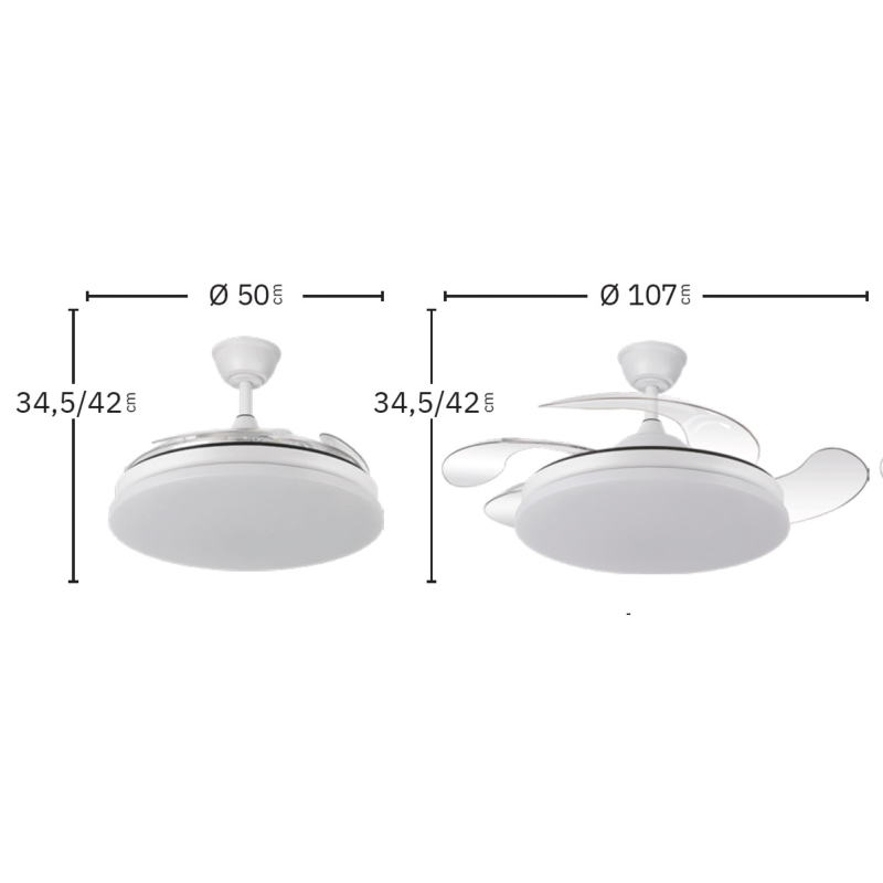 | Ventilador de Techo Tridente Fabrilamp | | Ventilador DC de la serie TRIDENTE realizado en metal, policarbonato y ABS, en color NÍQUEL con cuatro aspas DESPLEGABLES de ABS transparente muy resistentes. De diseño innovador, ideal para completar tanto en decoraciones modernas como clásicas, realizando tanto la función de lámpara como de ventilador. Motor DC con seis velocidades ajustables. Tecnología LED integrada con una potencia de 59W, 6980 lúmenes y 3 TEMPERATURAS SELECCIONABLES DE LUZ (3000-4000-6000K) luz cálida, natural y blanco frío. Es REGULABLE EN INTENSIDAD, con mando a distancia INCLUIDO con MEMORIA DE COLOR incorporada y TEMPORIZADOR 2/4 H. Control de aire verano o invierno. Su medida es de 34,5/42X50 centímetros con las aspas plegadas y de 34,5/42X107 centímetros con las aspas desplegadas. Incluye dos tijas de 12,5 y 20 centímetros, para colocar a distintas alturas. Encontramos en esta serie dos tamaños de ventiladores y en los colores blanco, negro, níquel y cuero, para elegir el más le guste y el que mejor se adapte a su decoración. | Caracteristicas Ventilador Tridente Fabrilamp | Materiales | - Base Motor: Metal - Aspas: Acrílicas - Difusor inferior: Policarbonato | | Tonalidad de Metal | Níquel | Accionado mediante | Mando a distancia. | Programador de apagado | Sí. 1, 2, y 4 horas. | Numero de Aspas | 3 | Tonalidad de Aspas | Transparentes | Motor Tipo | DC - Bajo Consumo | Velocidades | 6 | Consumo / Flujo aire Revoluciones / Sonoridad | - 1ª velocidad: 7w - 3378m3/hora - 160 rpm - 20 dB - 2ª velocidad: 12w - 4323m3/hora - 180 rpm - 25 dB - 3ª velocidad: 17w - 5702m3/hora - 190 rpm - 30 dB - 4ª velocidad: 22w - 6898m3/hora - 200 rpm - 35 dB - 5ª velocidad: 27w - 7963m3/hora - 220 rpm - 40 dB - 6ª velocidad: 32w - 8958m3/hora - 240 rpm - 45 dB | Función Invierno | Sí | Luz | Si - Luz LED de 59w. | Datos de Luz | 6980 lúmenes | | Tonalidad de la Luz | Seleccionable (3000-4000-6000k) Con Memoria | Posible montaje sin Barra | No | Posible montaje en techo inclinado | Sí* | Grafico de medidas Ventilador Tridente Fabrilamp |