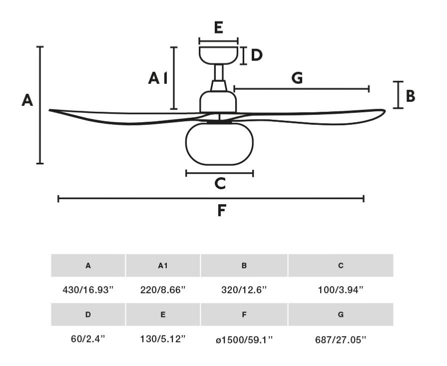 Materiales | - Base Motor: Acero - Aspas: ABS -Difusor: Cristal | | Tonalidad de Metal | Marrón oscuro | Accionado mediante | Mando a distancia. | Programador de apagado | Si | Numero de Aspas | 3 | Tonalidad de Aspas | Nogal | Motor Tipo | DC - Bajo Consumo | Velocidades | 6 | Velocidades / Consumo | - 1ª velocidad: 73 rpm - 5w - 2ª velocidad: 92 rpm - 8w - 3ª velocidad: 108 rpm - 12w - 4ª velocidad: 127 rpm - 18w - 5ª velocidad: 141 rpm - 25w - 6ª velocidad: 152 rpm - 35w | | Flujo de Aire | 187 m3 | Función Invierno | Si. Activada en el mando. | Luz | Sí - 1 bombilla E27 (no incluida) | Posible montaje sin barra | No | Posible montaje en techo inclinado | Sí* | Grafico de medidas Ventilador Outwood L Faro | |