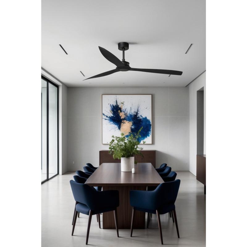 Versión grande de JUST FAN. Este ventilador de techo moderno es ideal para estancias a partir de 28m2. Accionado por mando a distancia, incluido, y en acabado negro con palas negras. Este ventilador de techo con motor DC de bajo consumo, dispone de 6 velocidades regulables con un consumo de 4-6-9-12-17-31W y 48-64-82-98-114-145 revoluciones por minuto según velocidad. Este ventilador tiene función inversa verano-invierno, por lo que podrá utilizarlo también en invierno mejorando la eficiencia de su sistema de calefacción.