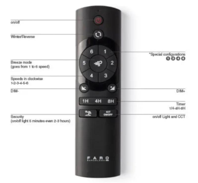 Mando a distancia Ventilador de techo Faro. (No incluye receptor) Solo para modelos que monten este emisor físicamente. -6 velocidades. -Modo Brisa -Funcion Dimado de luz -CCT -Programación de apagado automatico.
