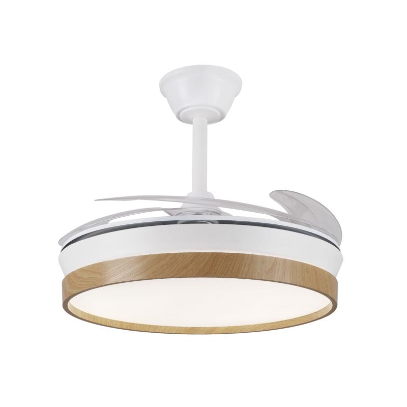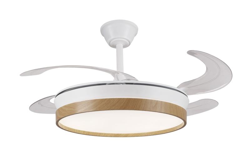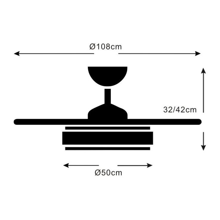 Materiales | - Base Motor: Policarbonato - Aspas: ABS - Difusor inferior: Acrílico | | Tonalidad de Metal | Blanco filo madera | Accionado mediante | Mando a distancia. | Programador de apagado | Sí. | Numero de Aspas | 4 | Tonalidad de Aspas | Transparentes | Motor Tipo | DC - Bajo Consumo | Velocidades | 6 | Velocidades / Consumo Flujo de aire / Sonoridad | - 1ª velocidad: 170 rpm - 6.2w - 3750m3/hora - 15dB - 2ª velocidad: 182 rpm - 7.3w - 4050m3/hora - 18dB - 3ª velocidad: 195 rpm - 9.5w - 4550m3/hora - 21dB - 4ª velocidad: 218 rpm - 13.6w - 5305m3/hora - 25dB - 5ª velocidad: 245 rpm - 18.2w - 5860m3/hora - 27dB - 6ª velocidad: 265 rpm - 26.5w - 6200m3/hora - 30dB | Función Invierno | Si. Activada en el mando. | Luz | Si - Luz LED de 36w+36w. | Lúmenes | 7200 lúmenes - Regulable en intensidad | | Tonalidad de la luz | 3000 - 4000 - 6000K Seleccionable. | | Luminaria incluida | Sí | Posible montaje en techo inclinado | No | Peso | 4.5 Kg | Grafico de medidas Ventilador Fiona L P&B |
